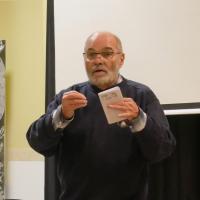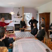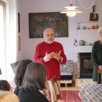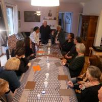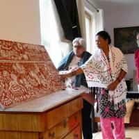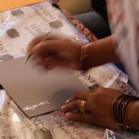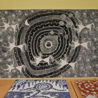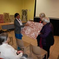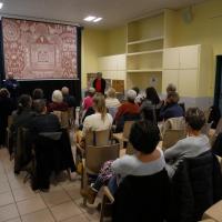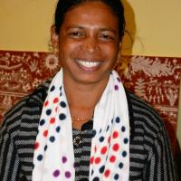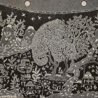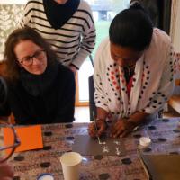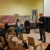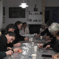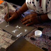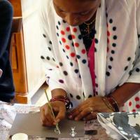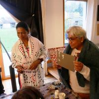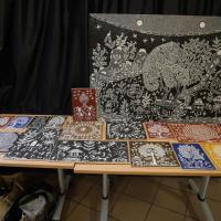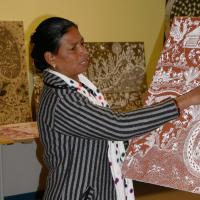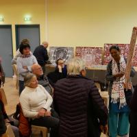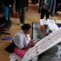> Au cours de l’ATELIER DÉCOUVERTE, les douze participantes ont été initiées aux codes narratifs de l’art pictural warli basé sur des formes simples : le triangle, le rond et les traits. La première étape de l’initiation a consisté à s’essayer à représenter les personnages : deux triangles pour le corps, un rond pour la tête et des traits pour les membres. Les femmes sont identifiées avec un chigon; les petites filles avec des nattes. Les animaux domestiques sont représentés avec le même code; seuls les animaux sauvages sont dessinés de façon plus réaliste. La deuxième étape de l’expérience a consisté à représenter une petite histoire et tenter de mettre les personnages en mouvement. L’exercice était proposé sur une toile recouverte de terre et de bouse de vache. Comme chez les Warlis, le pinceau était un bambou taillé. Ces exercices pratiques ont été introduits par plusieurs explications détaillées. L’une d’elles était présentée par Reena et sa traductrice Sumitra. Le tableau représentait une sorte de fable dénonçant l’inceste.L’histoire très imagée débute dans la rivière où se baignent des groupes de frères et sœurs et se terminent par la mort du coupable de l’inceste; la sœur, mariée de force, devenant entre temps déesse grâce à la complicité de sa grand-mère. Cette étroite relation entre le conte et le dessin a par ailleurs été présentée avec un petit film qui montre les détails d’un tableau «La malédiction du crabe», dont l’histoire est contée par une conteuse. La restitution de ce qui fût partagé au cours de cet atelier s’exprime difficilement avec les mots. Initialement un peu inquiètes d’être mises à l’épreuve du dessin, les participantes sont ressorties de l’atelier comme apaisées. La concentration, l’échange tacite, la bienveillance ont tissé des liens entre chacune, sous l’oeil attentif et léger de Reena, qui a su transmettre en quelques heures les premiers rudiments de la puissance évocatrice de son art.